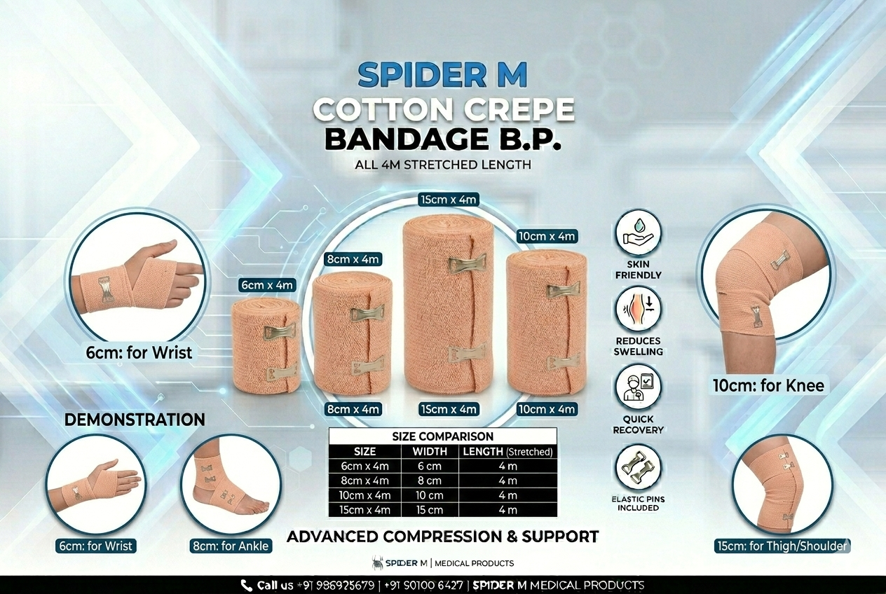 Our crepe bandages are carefully manufactured using high-quality cotton to provide excellent elasticity, comfort, and secure compression. Designed for medical applications, they offer breathable support that helps in injury recovery, sprain management, and muscle stabilization.